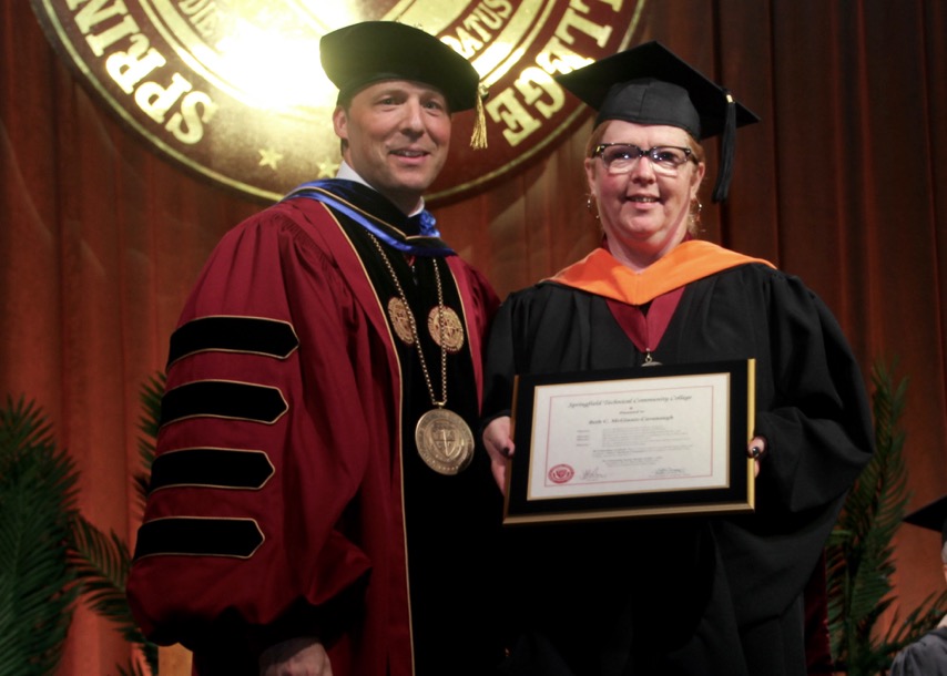 Dressed in formal academic attire at the STCC commencement, McGinnis-Cavanaugh, now a full-time physics and engineering professor, heard President John B. Cook call her name and ask her to join him on the stage at the MassMutual Center.